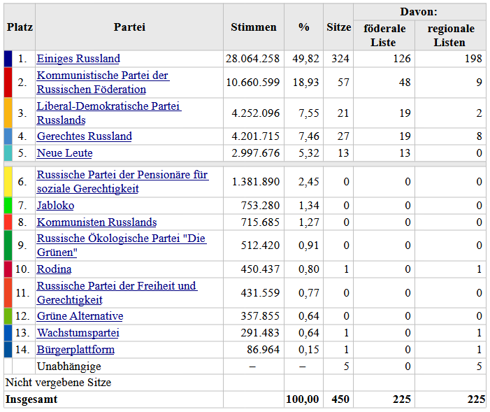 Vorläufiges amtliches Ergebnis der Wahlen zur VIII. Staatsduma der Russischen Föderation