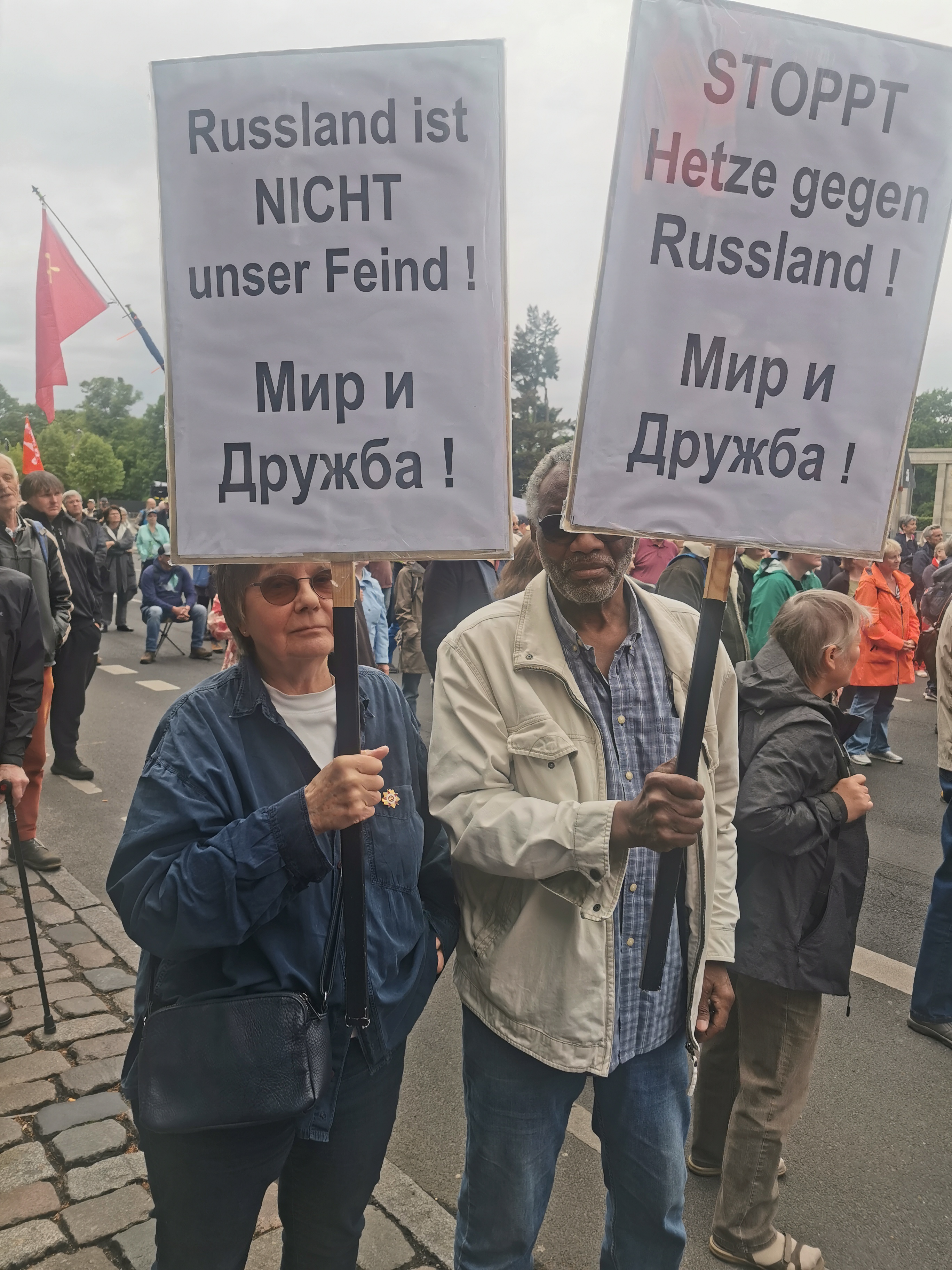 Am Samstag, den 3. Mai 2025, haben sich zahlreiche Menschen auf der Straße des 17. Juni hinter dem Brandenburger Tor in Berlin versammelt, um an den 80. Jahrestag der Befreiung vom Faschismus zu erinnern und ein Zeichen für "Frieden im gemeinsamen Haus Europa" mit Russland zu setzen.